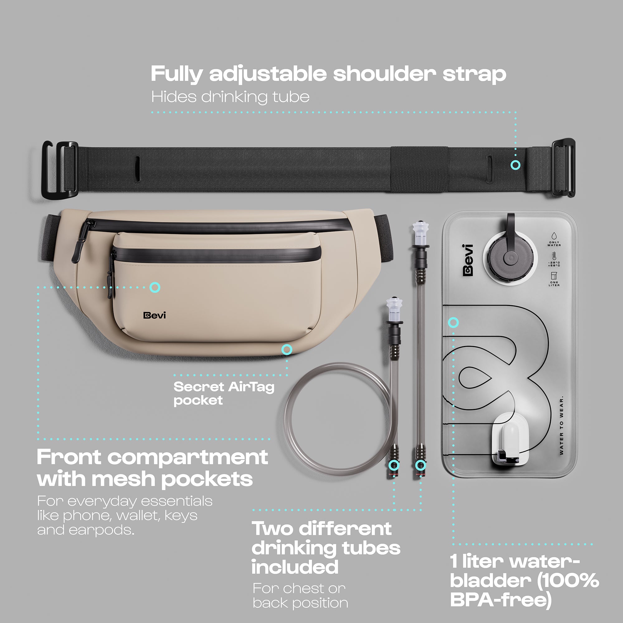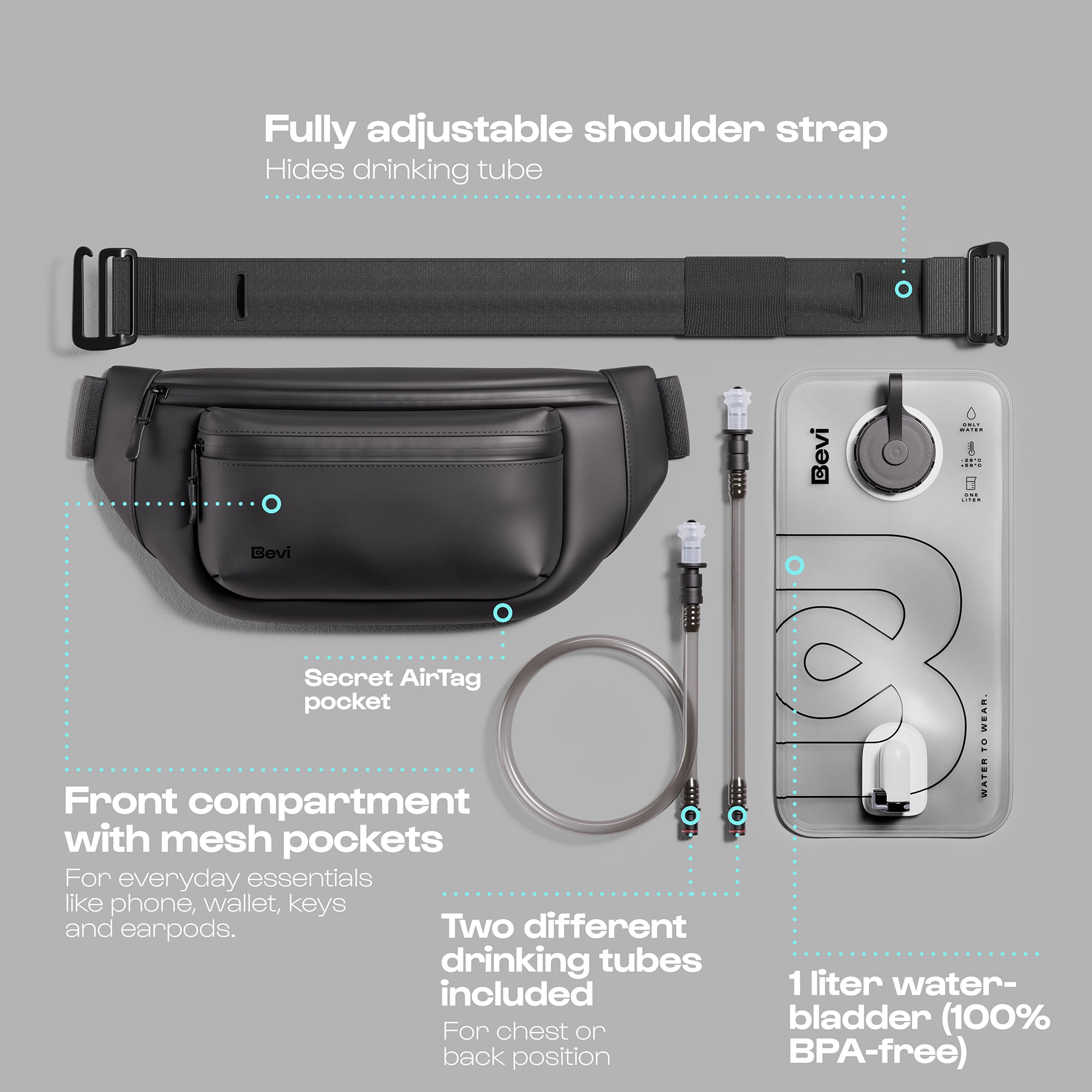 The full set includes: Bevi Bag (ca. 33x14 cm) • 1L water bladder (100% BPA free) • Shoulder strap • Long tube (45cm) • Short tube (12cm)