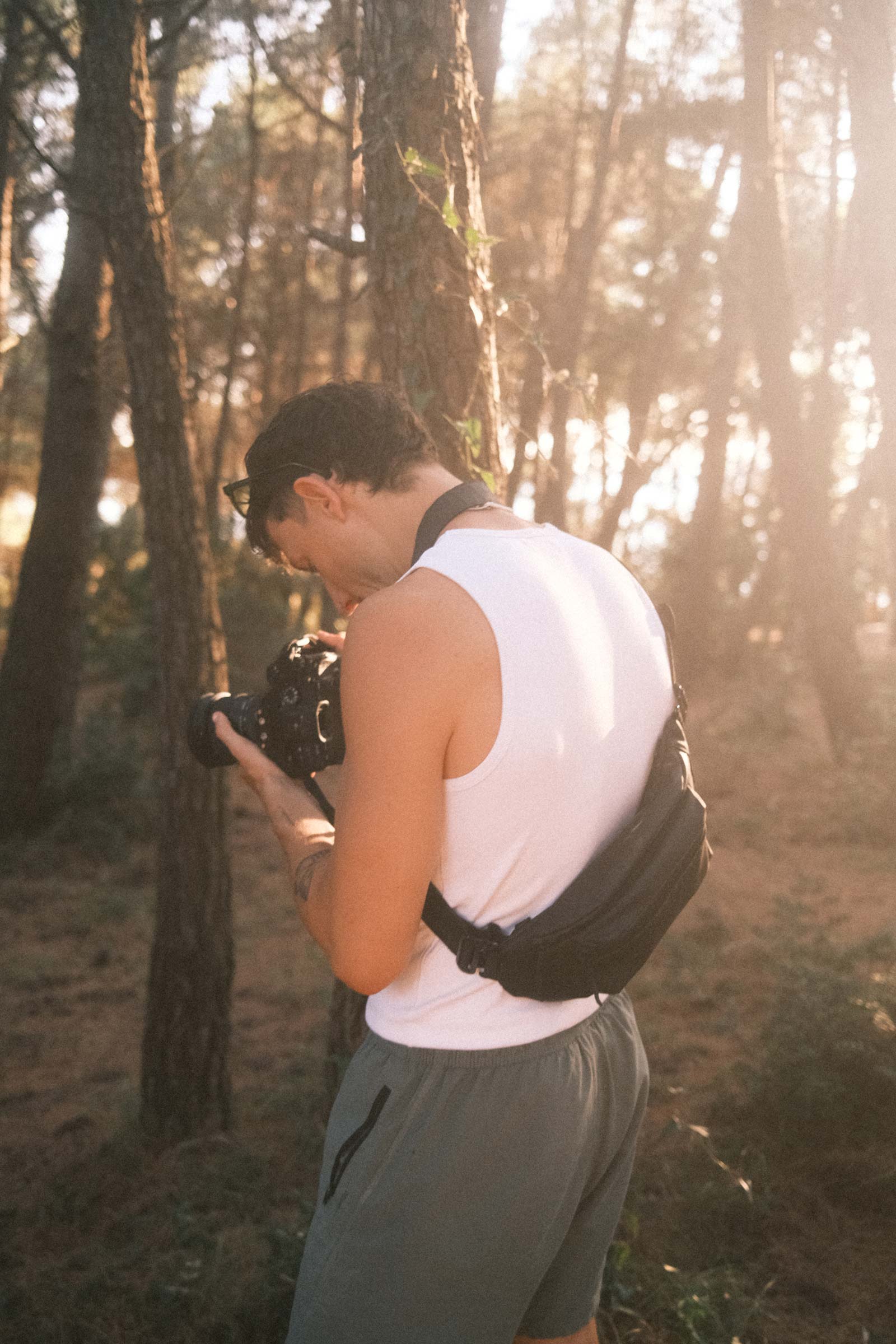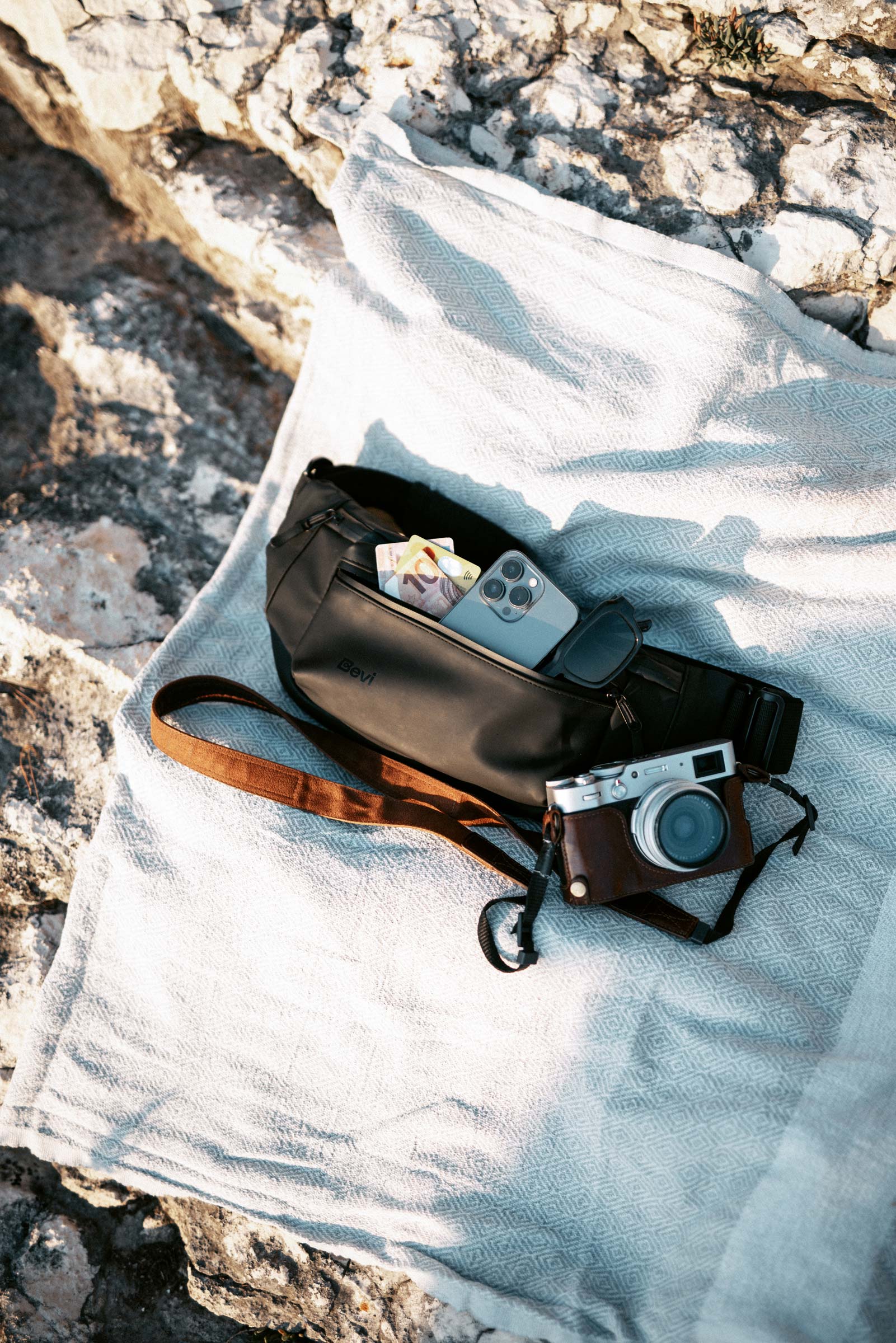 Using the buckle on the opposite side adjust the strap length to your desire. Roll up or secure any excess with the velcro strip.